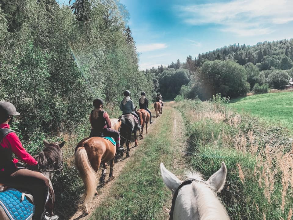 Praktiske rideklær som sitter godt, varme lag etter vær, regntøy ved behov, ridebukse eller tettsittende bukse uten grove sømmer, og solide sko eller støvler med liten hæl. Ta også med egen godkjent ridehjelm og sikkerhetsvest dersom du har. I tillegg anbefales toalettsaker, drikkeflaske, litt snacks, eventuelle medisiner og sengetøy ved overnatting.